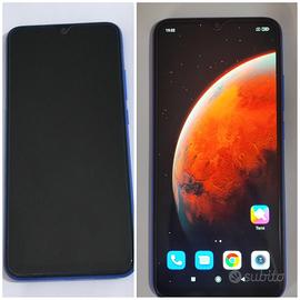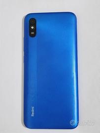 Xiaomi Redmi 9A blu smartphone con pellicola protettiva e caricabatterie.