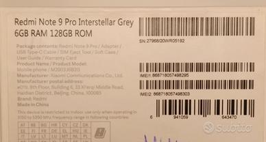 Xiaomi Redmi Note 9 Pro Acquistato in Italia (Euronics) scontrino disponle Lettore SIM e scheda di memoria 128 GB Cancellazione dei dati, Google e programmi Xiaomi installati. Caricabatterie e cavo GPS e sistema di posizionamento Fotocamera, WiFi e Bluetooth Valido per qualsiasi operatore telefonico Stato della batteria: uso medio. Tutti i dispositivi sono funzionanti al 100% Leggeri segni di utilizzo, schermo perfetto, scocca neta no difetti. Eventuale spedizione con TuttoSubito oppure esaminabile in Cuneo.