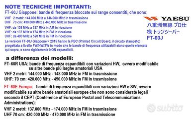 Trasmissione: VHF 144–146 MHz FM, UHF 430–440 MHz FM, non espandibile alle bande non amatoriali. Accessori inclusi: antenna flessibile UHF da 17 cm, clip da cintura, alimentatore con spina italiana 220 V (L) più un alimentatore aggiuntivo giapponese (A), entrambi 12 V – 2 A, batteria Ni‑MH nuova da 1400 mAh (modello FNB‑83) 7,2 V, manuale cartaceo in lingua giapponese, confezione originale.