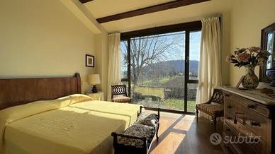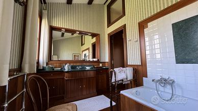 Salendo la scala si accede alla zona notte, caratterizzata da armadiature su misura in noce massello con boiserie e tappezzerie stile inglese. Il grande disimpegno con stufa, divide la camera suite dalle altre due.