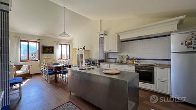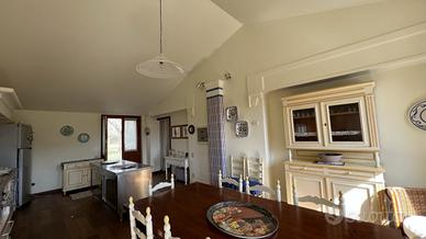 Attraverso l'ampio vano d'ingresso si accede alla generosa sala da pranzo dotata di camino centrale che scalda l'ambiente. Proseguendo accediamo alla cucina di ben oltre 35 mq, molto luminosa che è stata arredata per il piacere di condividere un gioioso momento di pranzo tutti insieme.