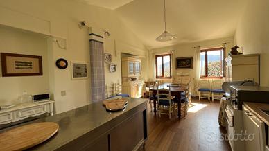 Entrando si è accolti da un bellissimo e ampio ingresso con scala elicoidale, in marmo e ferro battuto, che divide la zona giorno in due: da un parte l'area cucina e sala da pranzo e dall'altra la zona relax con soggiorno-salottino che affaccia sul portico.