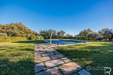 Rif:R06851CHAG (124451291) - Immerso in un paesaggio da sogno, circondato da alberi secolari e dolci colline, si presenta questo splendido agriturismo, accuratamente ristrutturato nel 2017. L'agriturismo si sviluppa su due piani, non collegati internamente, il che offre numerose possibilità sia per l'attività ricettiva che per l'uso privato. Al piano terra si trovano la reception, un bagno, un bar, una sala da pranzo e un accogliente soggiorno, che insieme creano un ambiente invitante per gli ospiti. Una cucina professionale consente di offrire un servizio di alto livello, mentre la loggia chiusa, come area esterna coperta, offre ulteriore spazio per momenti di convivialità o per uso gastronomico. Una scala esterna conduce al piano superiore, dove si trovano quattro incantevoli camere doppie, ciascuna con bagno privato. Ogni camera è arredata in modo personalizzato e convince per i materiali caldi, i colori chiari e, grazie alla posizione privilegiata, per una vista che ricorda un quadro. L'ampio parco che circonda la proprietà è un vero paradiso: prati ben curati, alberi secolari ombrosi e aree soleggiate offrono innumerevoli possibilità di relax e svago. Una scala in pietra conduce alla spaziosa area piscina, con una vasca di 12 x 7,5 metri (profondità 1,40 m) circondata da una splendida terrazza solarium. Sia il parco che la strada di accesso sono illuminati in modo suggestivo, creando un'atmosfera magica soprattutto nelle ore serali. La proprietà comprende un totale di 6,5 ettari di terreno con circa 100 ulivi, terreni agricoli e boschi, ideali per l'uso agricolo o semplicemente come rifugio immerso nella natura. Se interessati, c'è anche la possibilità di acquistare terreni adiacenti per ampliare ulteriormente la proprietà. Un luogo ricco di fascino e storia, perfetto per chi desidera combinare la vita di campagna con stile, comfort e autenticità. - Classe: G - IPE: 175.00 kWh/mq anno