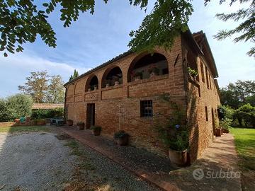 Casale tipico dalle antiche origini, risalente al 1700 posizionato in collina con bella vista panoramica sulla Val D'Orcia e Montalcino distante 7 km, la proprietà è formata da più edifici e 16 ettari di terreno, casale padronale di 400 mq composto da magazzini, lavanderia, bagno e cantine al piano terra, vano scala per il piano primo con arrivo a suggestivo loggiato, soggiorno con camino, cucina, 3 camere, studio, bagno, a pochi metri dal casale annesso di 40 mq, più distante altro fabbricato ex fienile da recuperare, capannone di 400 mq, tutto intorno ai fabbricati 16 ha di terreno di cui 14 ha a seminativo, 2500 mq di oliveto, bosco e molto importante un lago utilizzato per irrigare, attrezzature agricole.