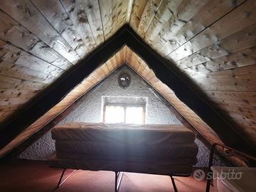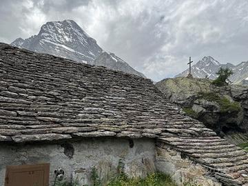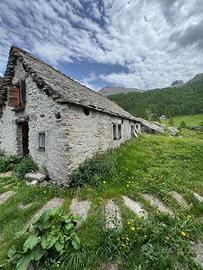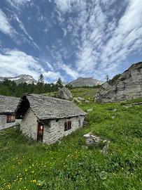 Nella località "La Balma", presso il grande masso erratico, proponiamo una antica baita del 1801, resa abitabile nel 1971, che comprende un soggiorno con cucinino e camino al pian terreno, bagno e, con scaletta interna in legno, due camerette ricavate nel sottotetto. Sul fianco una legnaia.