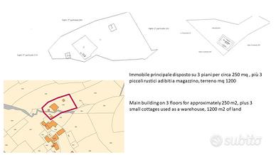 Seminterrato, piano primo, sottotetto. 80 mq per piano. Da Ristrutturare. Libero su 4 lati. Terreno adiacente mq 1200. Bosco 2000 mq. Castagneto da frutto 3500 mq. Presenti 3 capanni in pietra esterni. A 15 minuti dagli impianti di Garessio 2000.