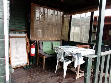 Piani dei Resinelli, LC - ai piedi della Grigna; quota mt. 1283. Casetta in legno abbinata ad una roulotte stanziale posizionata all'interno del campeggio. Completamente ristrutturata; non ha bisogno di alcun intervento; è abitabile da subito. Riscaldamento con 2 stufe a gas. Due cucine: quella standard della roulotte, + una cucina a gas nella casetta con 4 fornelli e forno; due frigoriferi: uno standard della roulotte e uno da lt. 80 c. a. Due ripostigli capienti accessibili dall'esterno + gavone di prua della roulotte. Bellissimo TERRAZZO spazioso, coperto e completamente ombreggiabile; contiene un grande tavolo in legno (6/8 posti), una panca + spazio per 1 o 2 sdraio. Bagno; wc chimico con seduta normale e tanica esterna; SCALDABAGNO a gas x acqua calda; scarico a pavimento x doccia.