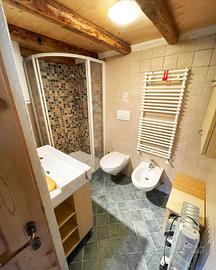 Bagno al piano terra con doccia, wc, bidet e lavabo.