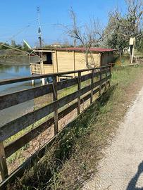 All'interno del capanno è presente una grande veranda con una zona per la pulizia del pesce, uno sgabuzzino ed un tavolo per 10/12 persone.