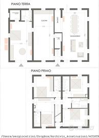 Piano terra con ampio soggiorno e cucina a vista, salone doppio con camino e primo bagno.