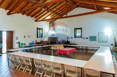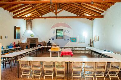 - Ampio locale pranzo con circa 70 posti a sedere, camino in pietra e travi a vista, ideale per eventi o attività ricettive.