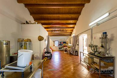 La struttura si sviluppa su una superficie coperta di 353 mq, distribuiti su più livelli. Al piano terra troviamo una dependance di 85 mq, attualmente adibita a sala per la lavorazione dellolio, e una unità abitativa principale di 135 mq. Al piano seminterrato si estendono due ampi magazzini di 133 mq, perfetti come depositi o per ulteriori sviluppi funzionali.