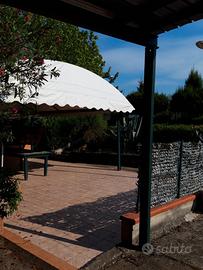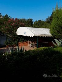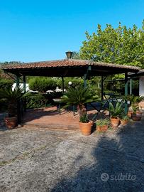 un gazebo esagonale con struttura in ferro e tegole, da un altro gazebo in ferro e tendone,