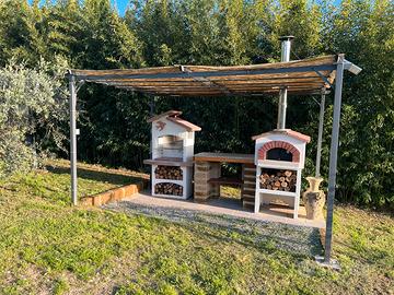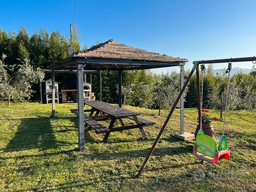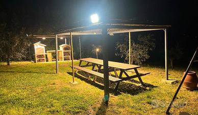 Abbiamo due pergole, entrambe con luce e servizio presa corrente , una accanto al casolare con tavolo allungabile da 10 persone, e una accanto ai giochi sul prato da 16 / 18 persone. Abbiamo una fontana (non potabile). Colonnina ricarica per bici elettriche e giochi bambini . Barbecue, forno a legna , frigo e microonde. Disponiamo di un bagno . Il prezzo è da riferirsi a persona adulta incluso consumo legna . Per bambini prezzo da concordare . A presto !