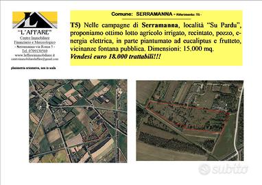 T5) Nelle campagne di Serramanna, località "Su Pardu", proponiamo ottimo lotto agricolo irrigato, recintato, pozzo, energia elettrica, in parte piantumato ad eucaliptus e frutteto, vicinanze fontana pubblica (a soli 500 metri). Dimensioni: 15.000 mq. Vendesi euro 18.000!!!