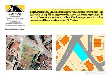 E12) Serramanna, adiacente lottizzazione San Leonardo, proponiamo lotto edificabile di mq 551 ad angolo su due strade, con ottima esposizione, 50 metri di fronte strada, ottimo per villa unifamiliare, bifamiliare o per costruire villette indipendenti. Il Lotto ricade in Zona B/2, nelle vicinanze troviamo: la pineta (parco pubblico), le poste, scuole elementari, centri commerciali ecc...