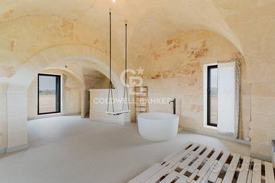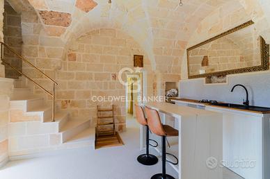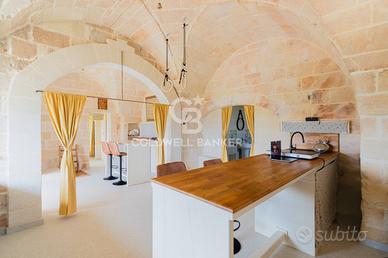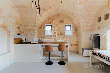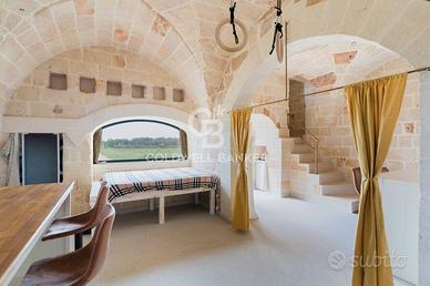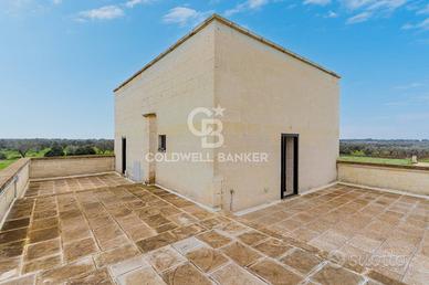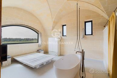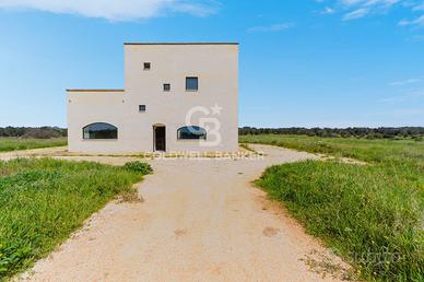 Rif: CBI069-1441-133143 Classe energetica: A1 - EPglnr: 64.98 kWh/m² SAN PANCRAZIO SALENTINO Nel cuore della campagna salentina proponiamo in vendita unesclusiva masseria completamente ristrutturata di circa 160 mq immersa in un contesto naturale di rara bellezza e circondata da circa 3,5 ettari di terreno interamente recintati da caratteristico muretto a secco. Un suggestivo viale dingresso conduce alla proprietà, garantendo privacy e fascino sin dal primo accesso. La masseria si sviluppa su due livelli ed è pensata per chi desidera vivere nella quiete della natura senza rinunciare a comfort, eleganza e soluzioni moderne. Gli ambienti interni sono valorizzati da splendide volte a stella con pietra a vista, che conferiscono autenticità e unatmosfera calda e raffinata. Al piano terra si apre una luminosa zona living composta da cucina e soggiorno, affiancata da un bagno a servizio della zona giorno. Completa il livello una camera da letto con bagno privato e una suggestiva vasca al centro della stanza, oltre a un pratico vano tecnico/lavanderia. Una raffinata scala interna in marmo conduce al primo piano, dove troviamo unulteriore camera da letto con bagno interno e, anche qui, una scenografica vasca centrale, disimpegno e accesso diretto a un ampio terrazzo panoramico di circa 50 mq, ideale per momenti di relax con vista aperta sulla campagna. Il vero punto di forza della proprietà è la vista: da ogni ambiente si gode di un panorama completamente aperto sul verde incontaminato, che regala luce naturale, profondità e una costante sensazione di pace e connessione con la natura. Il terreno circostante ospita giovani alberi da frutto e ulivi, piantati di recente; è dotato di impianto di irrigazione che copre lintera superficie, oltre a pozzo artesiano. La proprietà è dotata di riscaldamento a pavimento e infissi in alluminio a taglio termico con zanzariere integrate, garantendo comfort abitativo in ogni stagione. Inoltre, limmobile è...