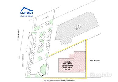 Vendiamo in aderenza con il centro commerciale "La Corte Del Sole" a Sestu, a 10 km da Cagliari, un lotto di circa 2.400 mq con progetto approvato per la realizzazione di una struttura commerciale di 800 mq al piano terra e ulteriori 700 mq al piano primo. Possibilità di acquistare il lotto con il progetto approvato o anche il fabbricato realizzato dalla società venditrice previ accordi.