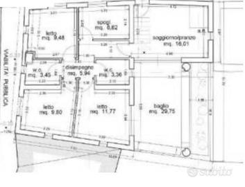 Accesso da strada comunale su vicolo con 2 possibili accessi, lotto posto auto privato in zona, terrazza con area verde, 2 bagni, 3 camere letto, ripostiglio, salone/cucina.