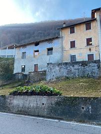 Edificio abitativo (porzione ROSA) con aderente ex-stalla (porzione AZZURRO), già adibita a box e deposito. Opportunità per un restauro a fini abitativi sia per uso stagionale che 1^casa, date le ampie metrature e gli spazi interni ed esterni.
