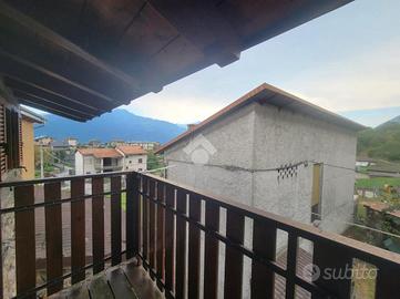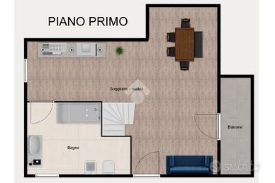 Al primo piano, l'abitazione si apre su un luminoso soggiorno, ben collegato a una cucina abitabile di generose dimensioni.