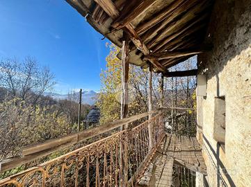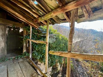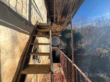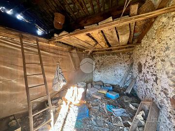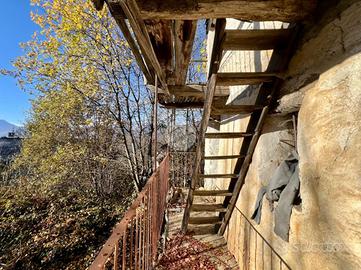 Dal balcone in cemento, una scala a pioli in legno conduce al secondo piano, dove il sottotetto ospita due locali adibiti a deposito, anch'essi accessibili da un balcone in legno.