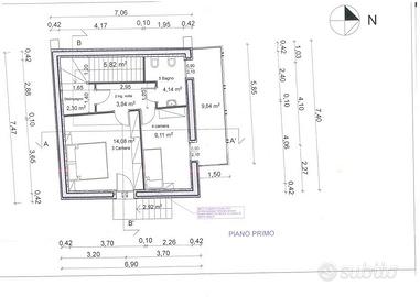 Da una scala interna si accede al piano primo, dove un disimpegno divide le stanze della zona notte. Sono presenti due camere da letto ed il bagno, finestrato e con accesso al balcone. Il balcone è accessibile anche tramite una delle camere da letto.