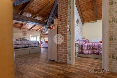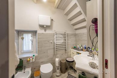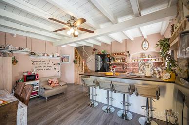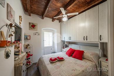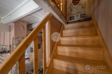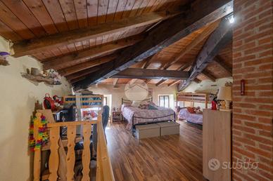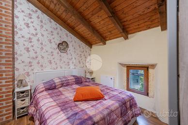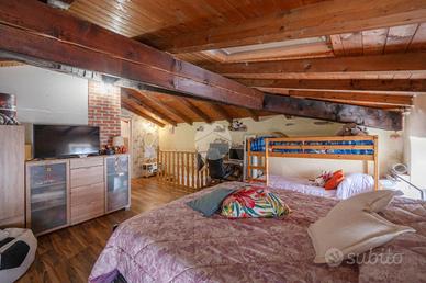Salendo al piano superiore, troviamo un secondo bagno finestrato, una camera matrimoniale e un ampio open space attualmente arredato con ulteriori posti letto, reso ancora più suggestivo dalla presenza di travi in legno a vista, che conferiscono calore e autenticità agli ambienti.