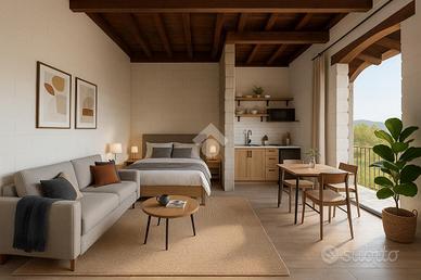 Al piano principale troviamo un open space pensato come monolocale, facilmente personalizzabile negli spazi e nella distribuzione interna, con bagno e affacci sul giardino circostante.