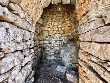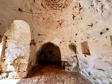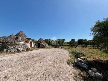 A property driveway of about 50 metres leads into the land and allows access to the structure we find on the left, consisting of a large four-cone trullo with high ceiling, original 'chianca' flooring, and a second attached trullo with a single cone.