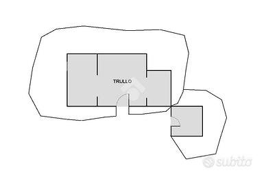 Un vialetto di proprietà di 50mt ca sfocia nel terreno e permette l'accesso alla struttura che ritroviamo sulla sinistra, composta da un ampio trullo a quattro coni con alto soffitto, pavimentazione in 'chianca' originale, ed un secondo trullo annesso con unico cono.