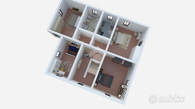 al primo piano vi è la zona notte con quattro ampie camere da letto e doppi servizi finestrati con vasca e doccia.