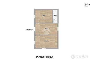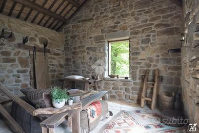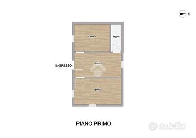 Una scala esterna conduce al primo piano, dove si trovano tre spaziose camere da letto e un ulteriore bagno, con un soffitto che esalta le travi di legno a vista, creando un'atmosfera calda e accogliente. Il rustico è inoltre dotato di pratici ripostigli.