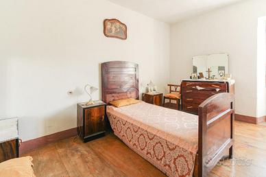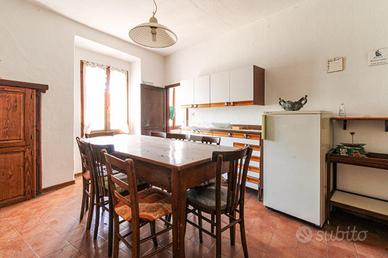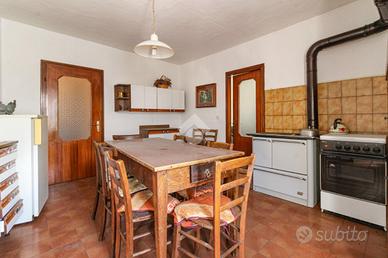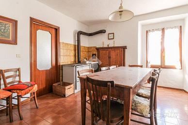 Al primo piano dell'immobile, vi sono una sala da pranzo con angolo cottura, zona giorno, un bagno di servizio e due locali, di cui uno con camino, utilizzati come depositi.