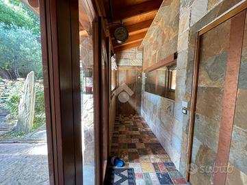L'abitazione, caratterizzata da finiture ricercate e di pregio, è così composta: ingresso su ampia zona giorno con cucina americana, soggiorno, zona pranzo e zona relax. l'intero spazio si sviluppa su di una superficie di 80mq al piano terra in un unico ambiente aperto e travato a vista, il quale si contraddistingue per le ampie finestre che si affacciano sul giardino, creando un continuum tra interno ed esterno, il tutto arricchito da un caminetto in pietra e dalla presenza di un tronco d'ulivo posto al centro attorno al quale sale la scala circolare di ferro battuto che conduce al piano superiore. Sempre al piano terra sono presenti, inoltre, due camere matrimoniali con accesso diretto anche dal giardino, ognuna della quali è dotata di bagno privato al suo interno. Al piano superiore è presente un'altra camera matrimoniale con annessa cabina armadio e bagno finestrato di 20mq con doccia e doppio lavandino.
