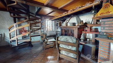 Il soggiorno open space ospita una cucina in muratura, camino a legna e una zona bar in legno massello, oltre a un bagno di servizio.