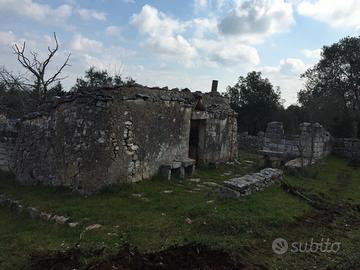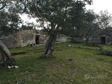 Vendo rustico in pietra, collabente, con poco meno di 4.000 metri di terreni con 29 ulivi, 2 loti, 3 ciliegi, 2 peri, due mandorli e altri alberi. C'è progetto per la ristrutturazione già presentato al Comune , anche per la vasca Imhoff. Accesso diretto da strada interpoderale