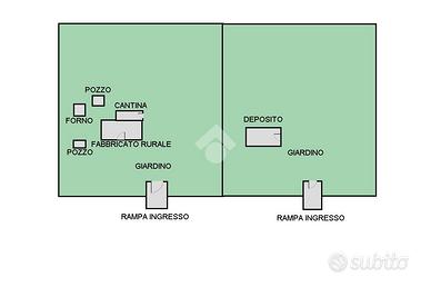Il terreno ha due ingressi privati chiusi da due cancelli. Dal primo ingresso, quello più in basso, si arriva a un fabbricato rurale di circa 30mq con camino e acqua diretta. Il terreno presenta due pozzi e un forno esterno in muratura. Dietro al fabbricato troviamo una cantina.