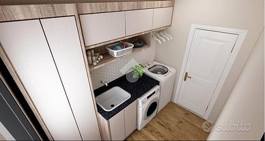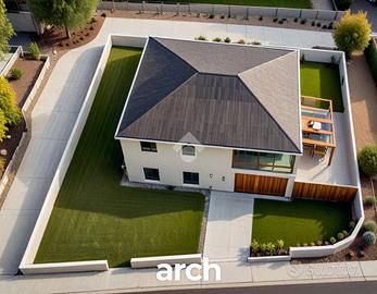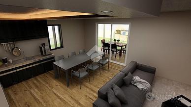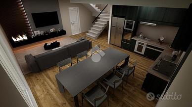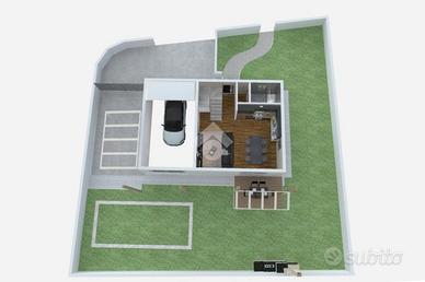 A piano terra ampia zona giorno open space con antibagno e bagno, giardino di circa 290 mq, garage di 30 mq, posto auto esterno