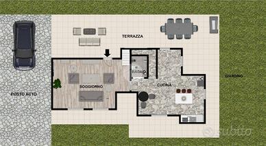 Il progetto presenta una villetta di circa 80 mq disposta su due piani, con soggiorno e cucina abitabile a piano terra circondati dalla terrazza e dal giardino.