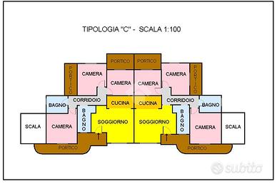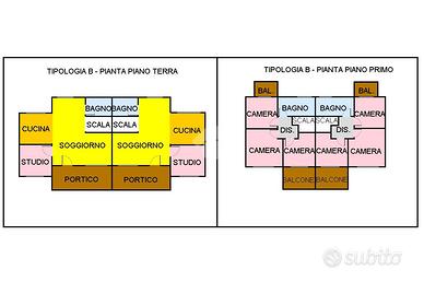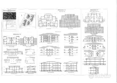- due fabbricati composti ognuno da quattro ville indipendenti, due con giardino su tre lati e due con giardino sul prospetto frontale e prospetto posteriore, due capofila e due centrali, per complessive otto unità. Ogni villa si compone di un piano terra con ingresso, ampio soggiorno con affaccio sul portico e sul giardino, cucina abitabile, studio e bagno; un piano primo composto da una camera matrimoniale, due camere singole con balcone ed un bagno.