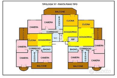 Ogni piano si compone di due appartamenti con soggiorno con cucina a vista, tre camere da letto e doppi servizi; un appartamento con soggiorno, angolo cottura, due camere e doppi servizi;