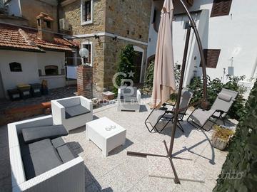 La sala ha un doppio accesso ad uno spazio aperto di circa 70mq per pranzi e serate all'aperto; esso è estremamente funzionale e vivibile anche 6 mesi all'anno ed è dotato di doccia esterna, piletta, un vano lavanderia, barbecue, forno a legna, legnaia e ripostiglio.