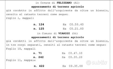 Vendo terreni situati nel comune di Felizzano e Viarigi. 4 mappali In foto ci sono i vari mappali WhatsApp 3490540943