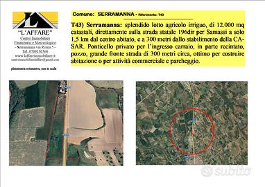 T43) Serramanna: splendido lotto agricolo irriguo, di 12.000 mq catastali, direttamente sulla strada statale per Samassi a solo 1,5 km dal centro abitato, e a 300 metri dallo stabilimento della CASAR. Ponticello privato per l'ingresso carraio, in parte recintato, pozzo, grande fronte strada di 300 metri circa, ottimo per costruire abitazione o per attività commerciale e parcheggio.