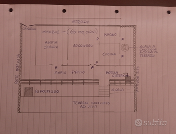 Non ho foto da mostrarvi e per farvi un idea ho disegnato la planimetria interna di come è suddiviso l'immobile e degli ampi spazi esterni, tramite la (scala a chiocciola) posizionata in fondo a sinistra , si accede ad un terrazzo calpestabile per quanto sono i metri quadrati dello stesso.