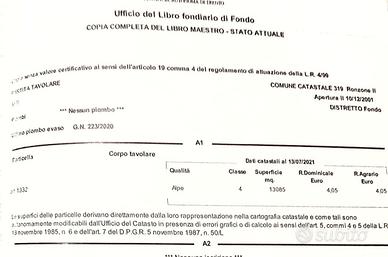 Fondo a Bosco identificato alla p.f. 1332 C.C. Ronzone, altezza 1533 m, esposizione sud-ovest e confinante con aree private e aree appartenenti al catasto di Bolzano. E' disponibile Perizia rilasciata da Agronomo con data del 11/06/2021- (Abeti e pini silvestri). 7.800 (metri cubi di legname)