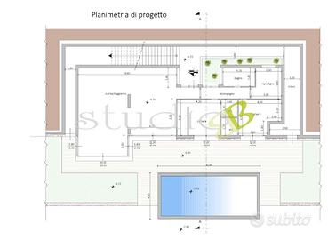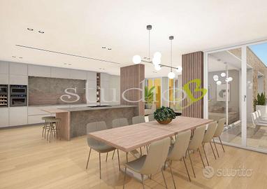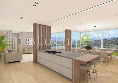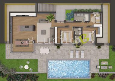 Il progetto prevede una luminosa zona giorno con soggiorno e cucina a vista, una zona notte composta da due camere matrimoniali con bagno privato, una terza camera da letto e un ulteriore bagno.