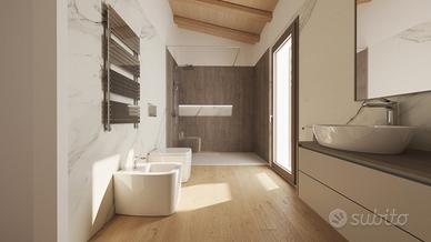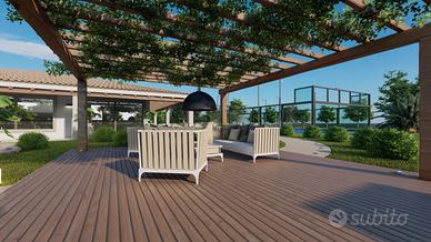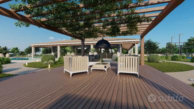 L'ingresso conduce alla zona giorno, che è composta da un ampio soggiorno, una cucina abitabile e un bagno di servizio. Il soggiorno è spazioso e luminoso, con una grande finestra che affaccia sul patio esterno. La cucina è abitabile e dotata di tutti gli elettrodomestici necessari. Il bagno di servizio è completo di vasca o doccia, lavabo e bidet.