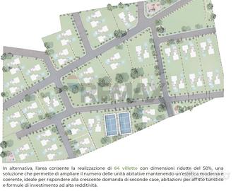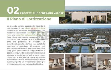 02 LA SECONDA OPZIONE progettuale riguarda la realizzazione di un piano di lottizzazione composto da 32 villette indipendenti di stile moderno, ciascuna con volumetria pari a 367 mc e una superficie calpestabile di 125 mq , o in alternativa larea consente la realizzazione di 64 villette con dimensioni ridotte del 50%, una soluzione che permette di ampliare il numero delle unità abitative mantenendo unestetica moderna e coerente con materiali naturali e soluzioni di design ispirate ai colori del paesaggio mediterraneo, ideale per rispondere alla crescente domanda di seconde case, abitazioni per turistico e formule di investimento ad alta redditività.